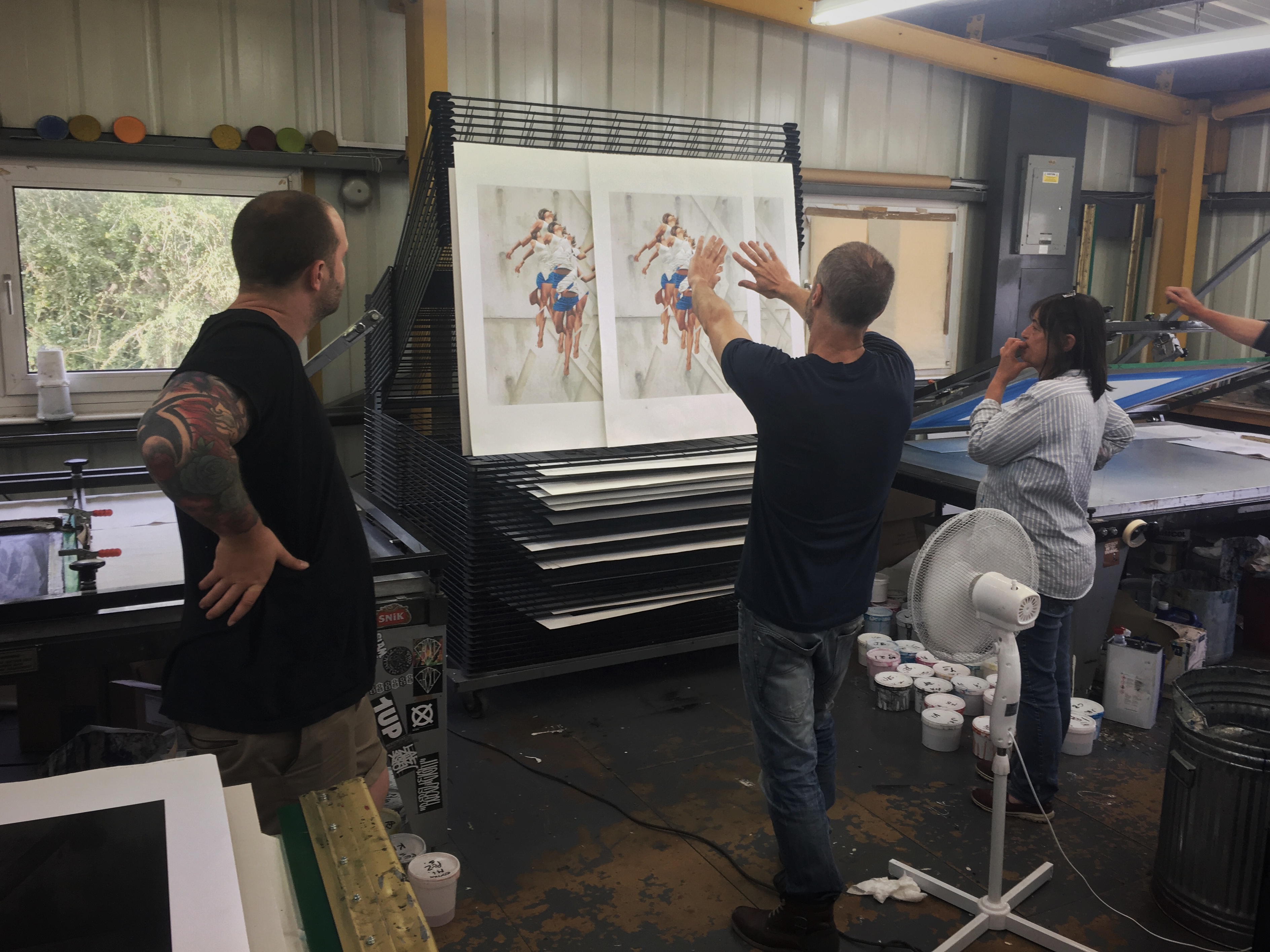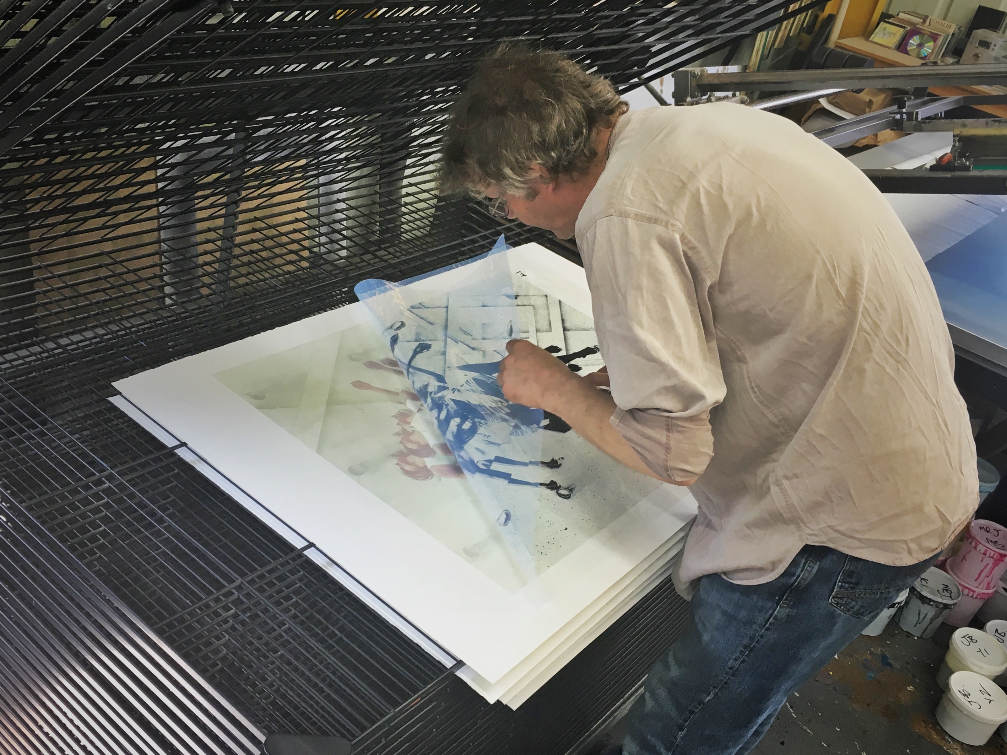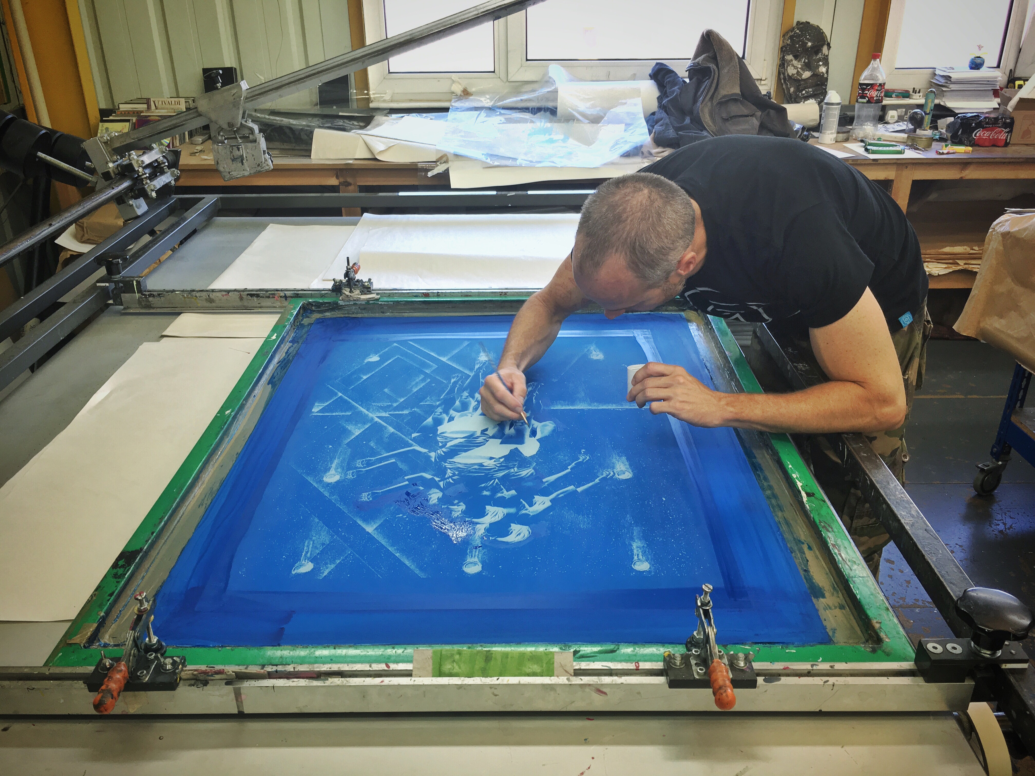 Last week we had the pleasure of having James Bullough in the studio for a few days. We have been working on James’ first ever screen print edition for the past few weeks and he came over to check over the proof and work on a few special variant editions and colour ways. The edition will be released at Graffiti Prints in a few weeks. Pictures from the proofing below…