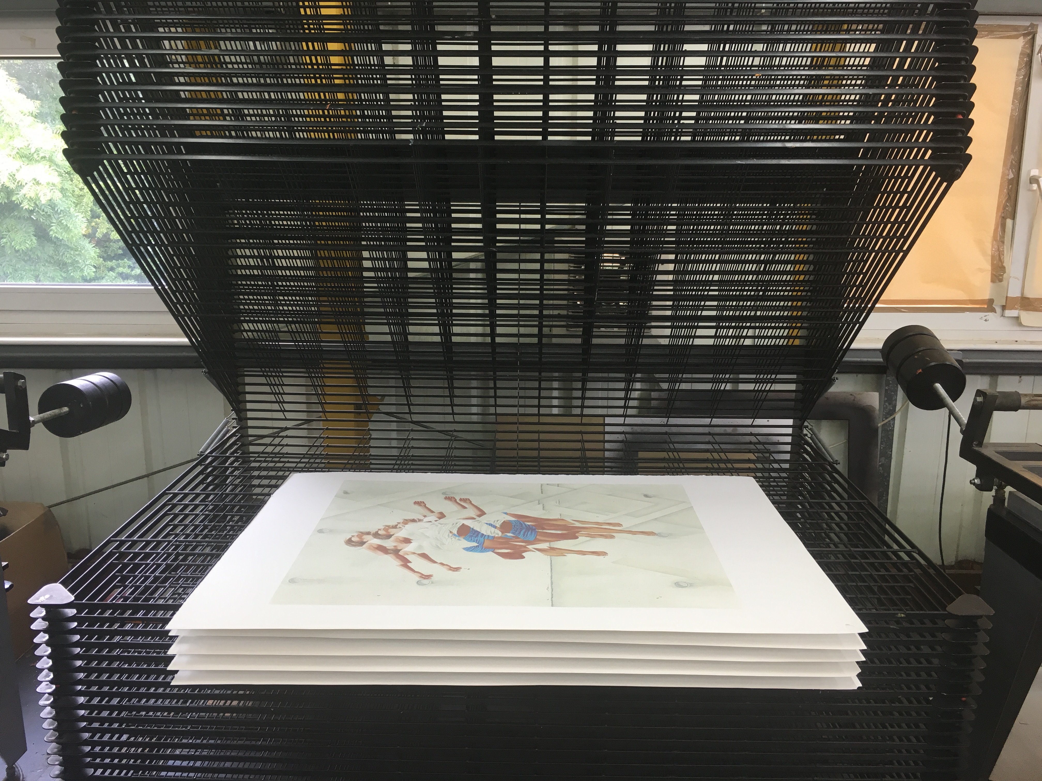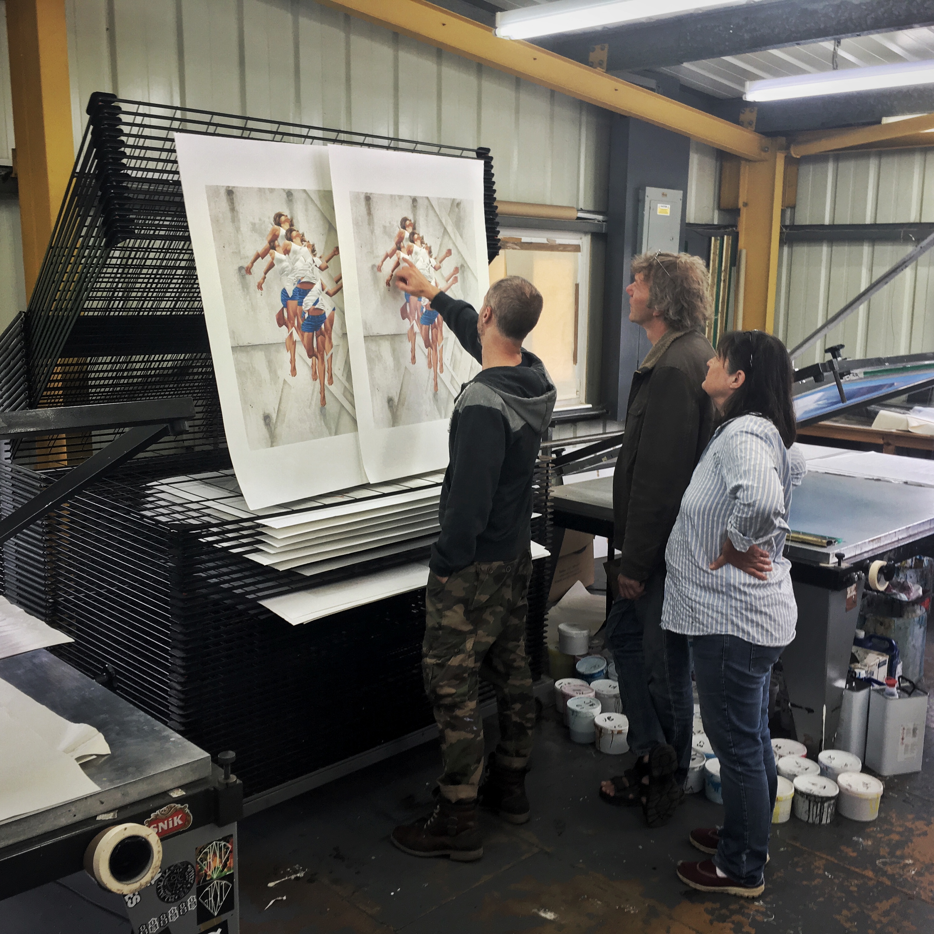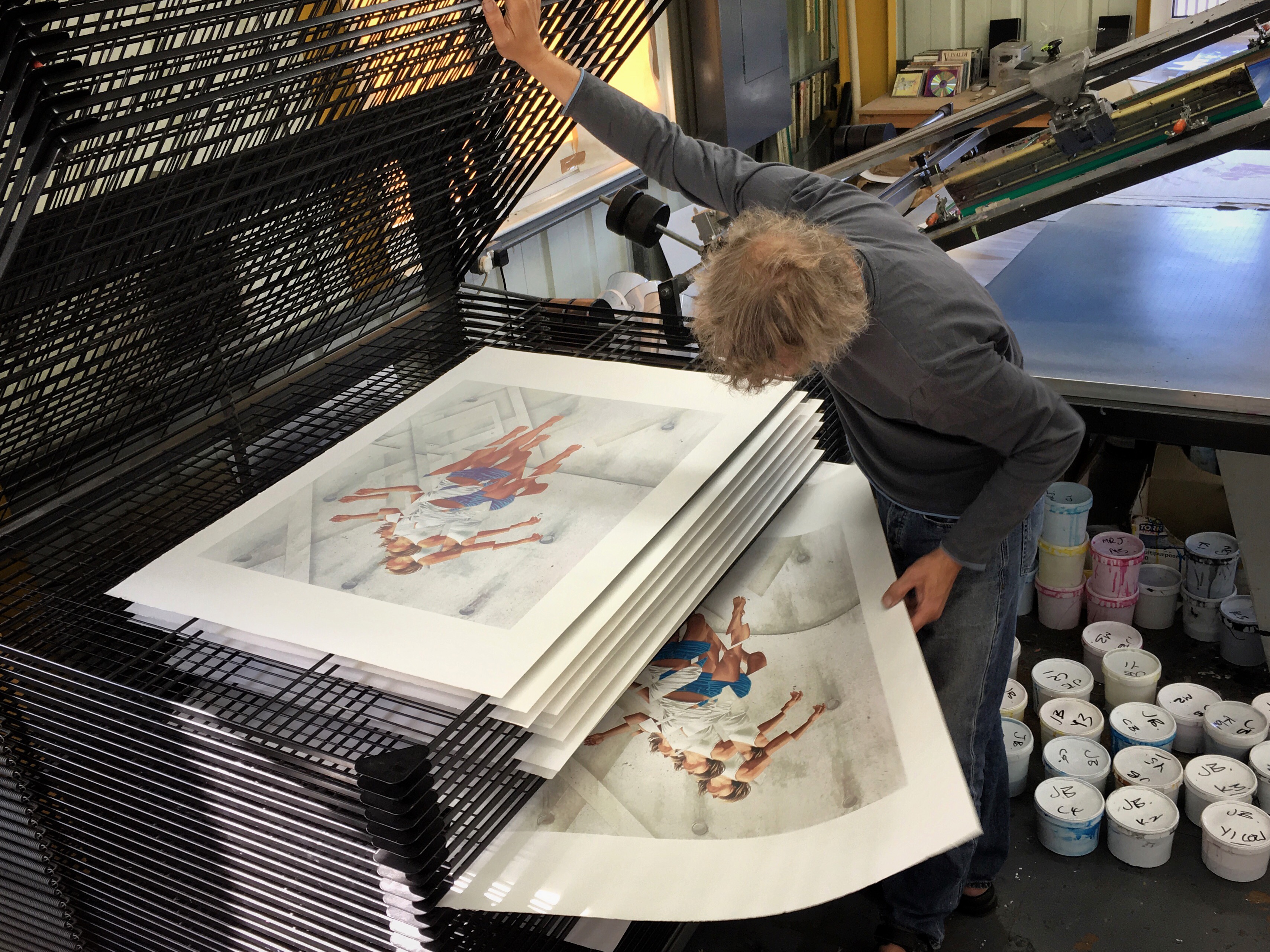 Last week we had the pleasure of having James Bullough in the studio for a few days. We have been working on James’ first ever screen print edition for the past few weeks and he came over to check over the proof and work on a few special variant editions and colour ways. The edition will be released at Graffiti Prints in a few weeks. Pictures from the proofing below…