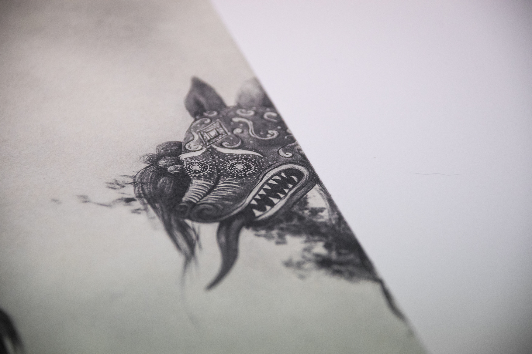 The print is based on an incredible wall Vanessa painted in her home town of Toulouse titled ‘La Symphonie des Songes’. We have used the process of chine-collé for this etching, whereby an extremely delicate, handmade Japanese paper is pressed into a heavier weight substrate paper as they go through the printing press. This enables us to maximise the amount of fine detail we can extract from the etching plate as well as providing a contrasting background colour to the image.