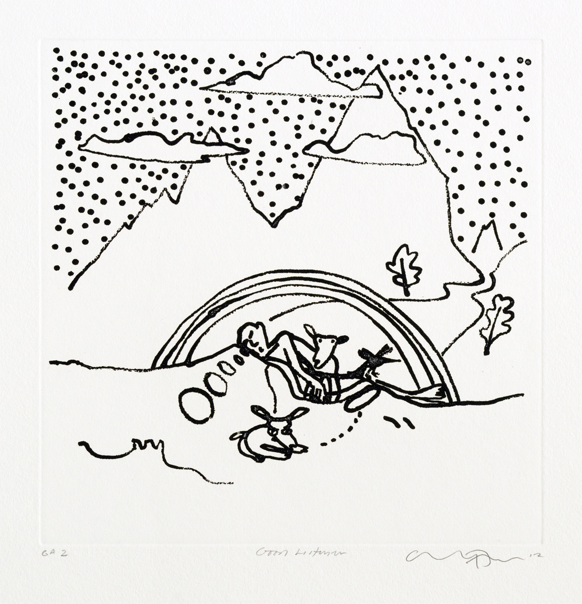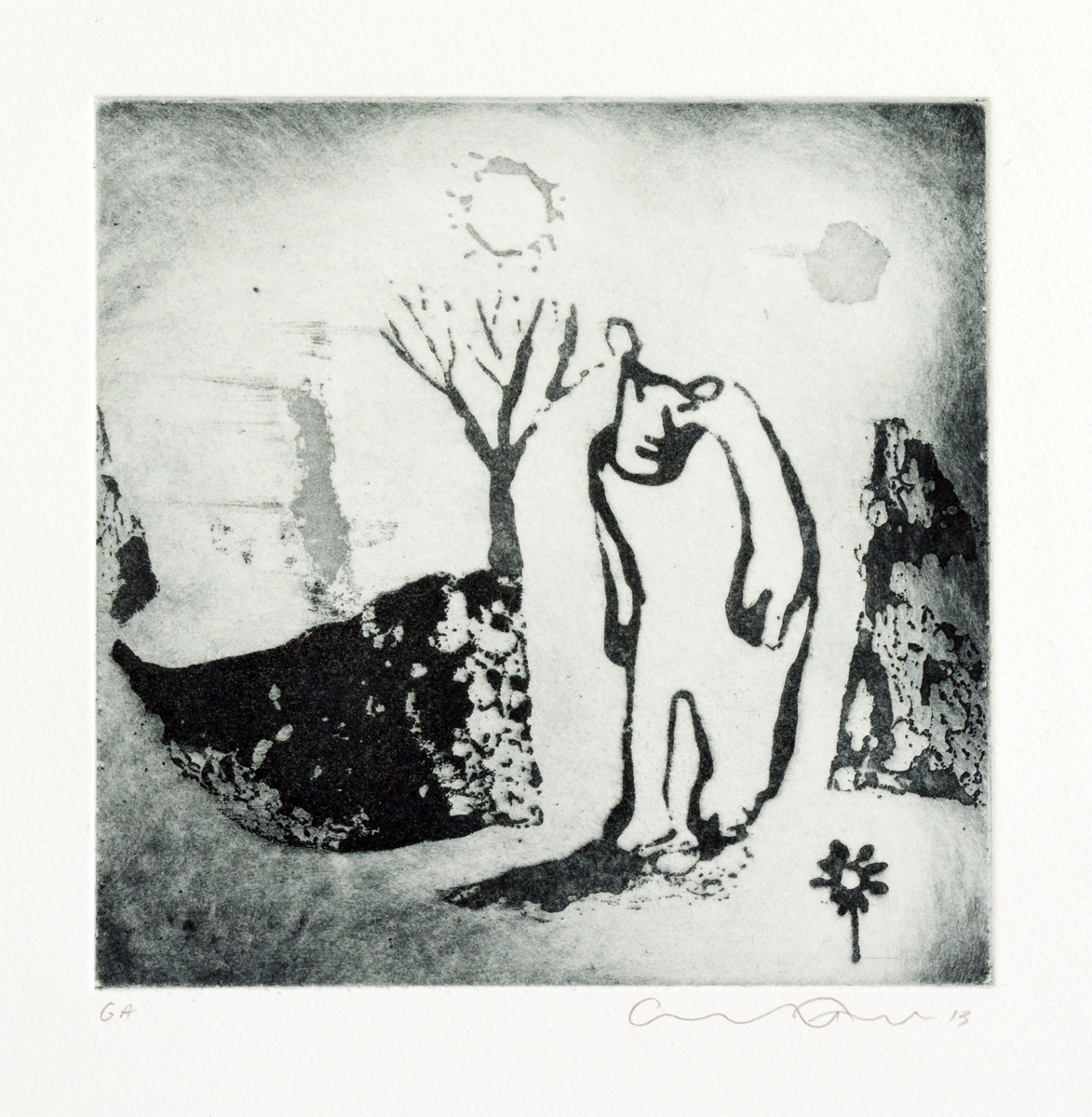 Wood’s work features magical, symbolic figures and signs, that the artist calls an exploration of the interior world of the imagination.
