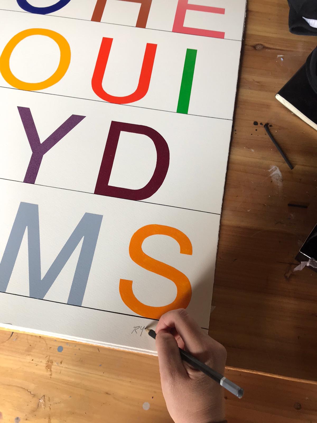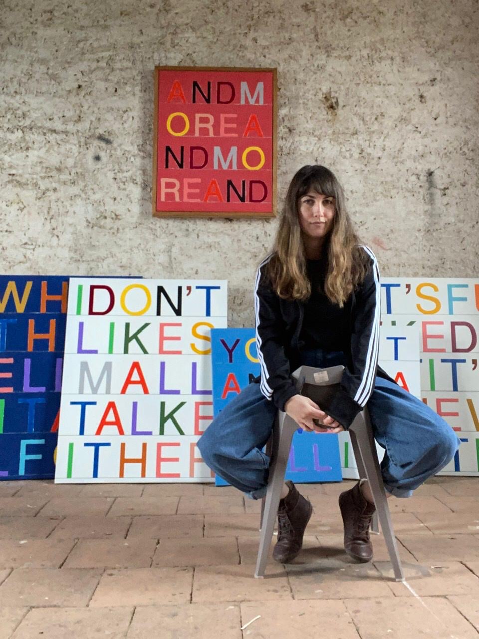 Her work moves between text art where she utilises chance in colour relationships, and abstract, geometric paintings; both sharing autobiographical elements with a reflection on society, and a minimalist approach.